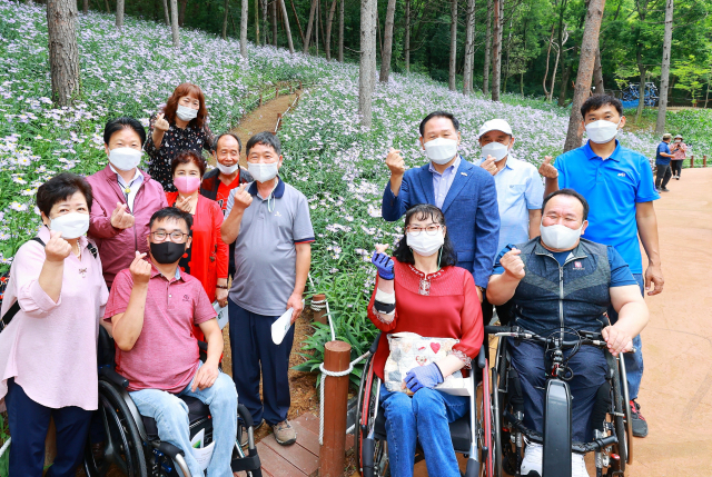 한국지체장애인협회 성주군지회 회원들과 도우미들이 벌개미취 꽃이 만발한 가야산무장애나눔길을 산행하고 있다. 성주군 제공