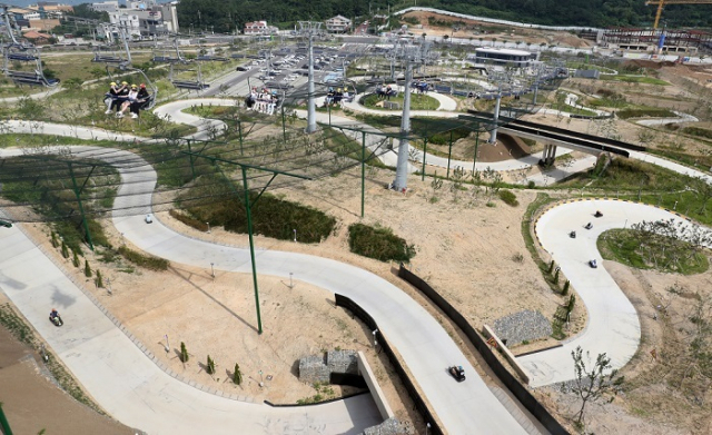 오시리아 관광단지의 대표 콘텐츠 중 하나인 ‘루지’. ‘스카이라인루지 부산’은 최저지점부터 최고지점까지 100m 정도 높이에 총 4개 트랙이 2.4㎞ 길이로 조성됐고 트랙 내 30여 개의 곡선 구간이 배치됐다. 강선배 기자 ksun@