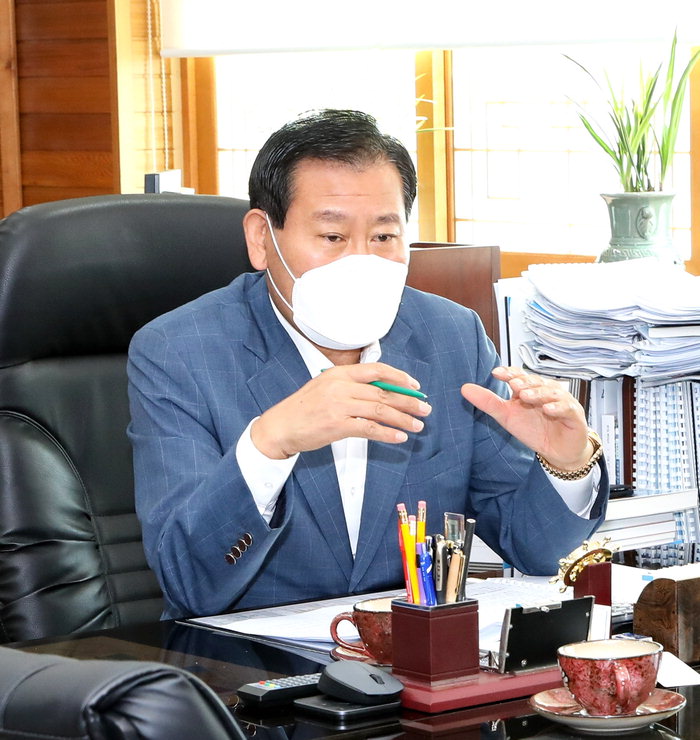 [충청투데이 박병훈 기자] 김재종 옥천군수가 취임 3주년을 맞았다. 옥천군은 그동안 많은 변화가 있었다. 김 군수는 국궁진력(鞠躬盡力)의 마음을 갖고 힘차게 군정을 이끌어왔고 의존재원 확보를 위해 역대 최대인 58건의 공모사업에 선정돼 총사업비 1940억원을 확보했다. 또한 충북도내 처음으로 군민 1인 10만원씩 선제적으로 재난극복지원금을 지급했으며 학생들에게 교육재난특별장학금도 지원했다. 민선 7기 3주년을 맞는 김 군수가 옥천 미래를 위해 그려온 청사진과 새로운 도전 앞에 당당히 맞서며 기존 관행에서 벗어나 보다 적극적이고 능동적으로 모든 문제를 풀어나가는 이야기를 들어본다.