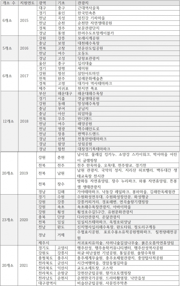2015년부터 2021년까지 열린관광지 49개소의 조성이 완료됐으며 현재 43개소는 관광시설 개·보수 공사가 진행되고 있다. 이번 2022년 열린관광지 공모는 관광지 개·보수에 드는 시간과 지자체가 지방비를 확보하는 시간을 충분히 확보해 기간 내 사업을 잘 추진할 수 있도록 일정을 당겨 추진한다고 문관부는 설명했다.
