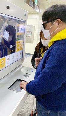 시각장애인이 부산역에 설치된 배리어프리 키오스크의 촉각 디스플레이로 개찰구 지도를 확인하고 있다. 사진 닷 제공