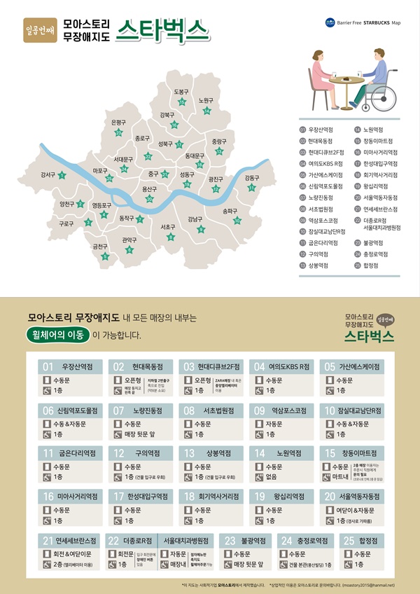 사회적기업 모아스토리는 20일 장애인의 날에 맞춰 장애인들이 이용하기 편한 서울의 스타벅스 무장애 지도를 공개했다.
