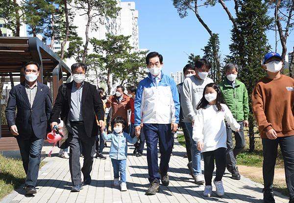 올해 식목일 직동근린공원에서 열린 ‘희망의 숲’ 조성 첫 행사에서 안병용 시장이 시민들과 걸어가고 있다.