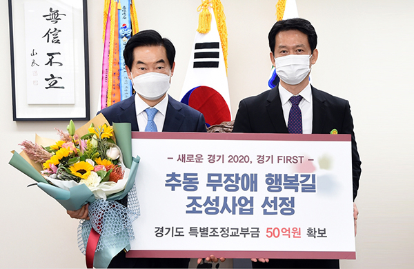 안병용 시장이 추동 무장애길 조성사업의 ‘새로운 경기 정책공모 2020, 경기 First’ 공모전 최우수상 수상을 기뻐하며 기념촬영을 하고 있다.