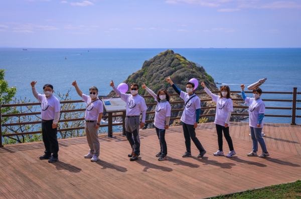 공한수 구청장 등 부산 서구청 장애인담당부서 직원들이 ‘제8회 담쟁이랜선걷기대회’ 코스인 암남공원 내 두도전망대에서 장애인식 개선을 위한 퍼포먼스를 하고 있다(사진=서구청)