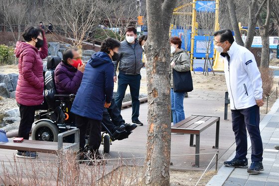 류경기 중랑구청장이 휠체어를 탄 구민과 대화하고 있는 모습(중랑구 제공).© 뉴스1
