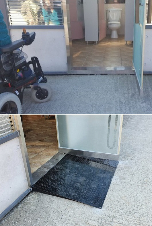 대구척수장애인협회 동구지회가 작년 10월 동구 금강동 반야월연근농심체험장 인근 화장실 입구의 문턱()을 지적하자 동구청은 작년 12월 해당 화장실 입구 앞에 경사로를 설치했다. 대구척수장애인협회 동구지회 제공