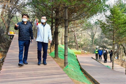 지난 9일 류경기(오른쪽) 중랑구청장이 봉화산 무장애길 공사현장을 찾아 둘러보고 있다. 중랑구 제공
