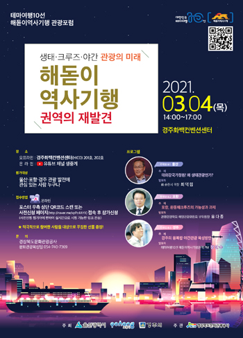 ‘생태·크루즈·야간 관광의 미래, 해돋이역사기행 권역의 재발견’이라는 주제로 각계 전문가들이 각 도시별 주요 관광 이슈에 대해 분석적이고 체계적으로 주제발표를 진행할 예정이다.