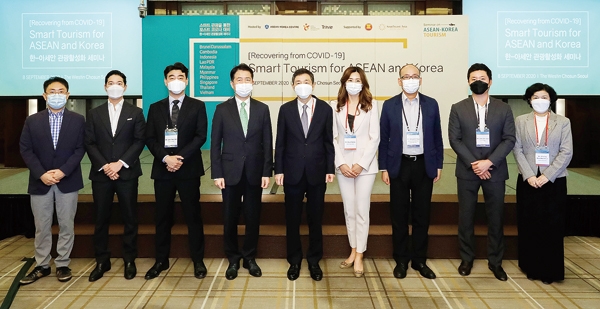 한-아세안센터, 한국관광공사, 트래비가 ‘위드 코로나 시대, 스마트 관광산업의 미래를 듣는다’를 주제로 한-아세안 관광 웨비나를 지난 8일 진행했다. 코로나19 확산 방지를 위해 최소한의 인원만 오프라인 발표를 진행했다. 한-아세안센터 이혁 사무총장(가운데), 한국관광공사 안덕수 관광기업지원실장(왼쪽 네 번째) 등 참가자들이 기념촬영을 하고 있다