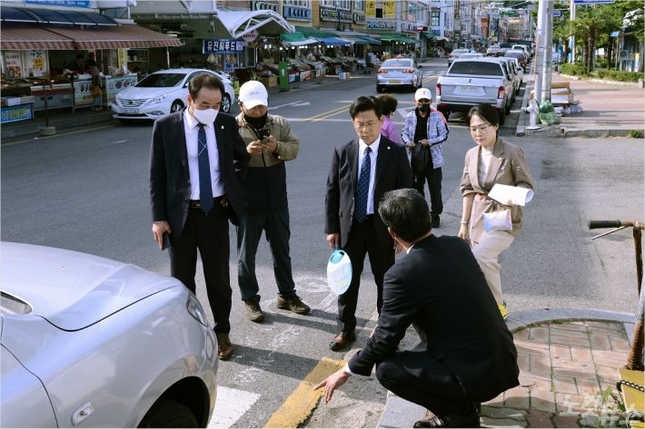 여수시의회 무장애도시정책 연구회 소속 의원들이 도심 속 장애물 실태를 점검하고 있다.