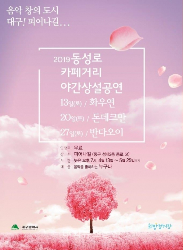 동성로 카페(식당) 야간상설공연은 과거 요정(料亭)이 흥했던 종로에 지난해 9월 자비로 풍류문화 전시관 등을 조성한 ‘피어나길’의 카페 설하정(중구 종로49-5) 앞마당에서 4월 13일부터 5월 25일까지 매주 토요일 저녁 7시에 총 7회 개최한다.특히 문화체육관광부에서 운영하는 봄 여행주간이 4월 27일부터 5월 12일까지로, 근대골목 등 대구를 찾는 관광객들에게 또 다른 볼거리 제공에 기여할 것으로 기대된다.