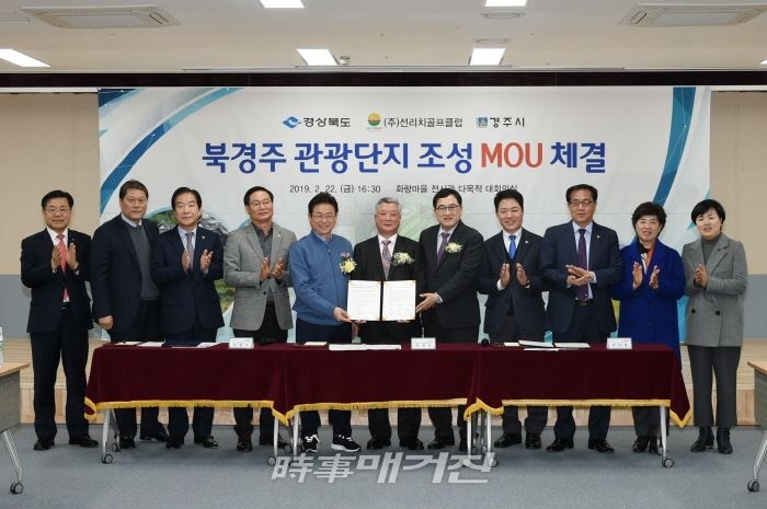 지난 22일 화랑마을 전시관에서 휴양, 스포츠, 힐링을 위한 복합관광단지인 가칭 ‘북경주 관광단지’ 조성사업에 대한 경상북도와 경주시,사업자인 ㈜선리치골프클럽 간의 MOU를 체결하였다. 2019.02.22. (사진_경주시청)