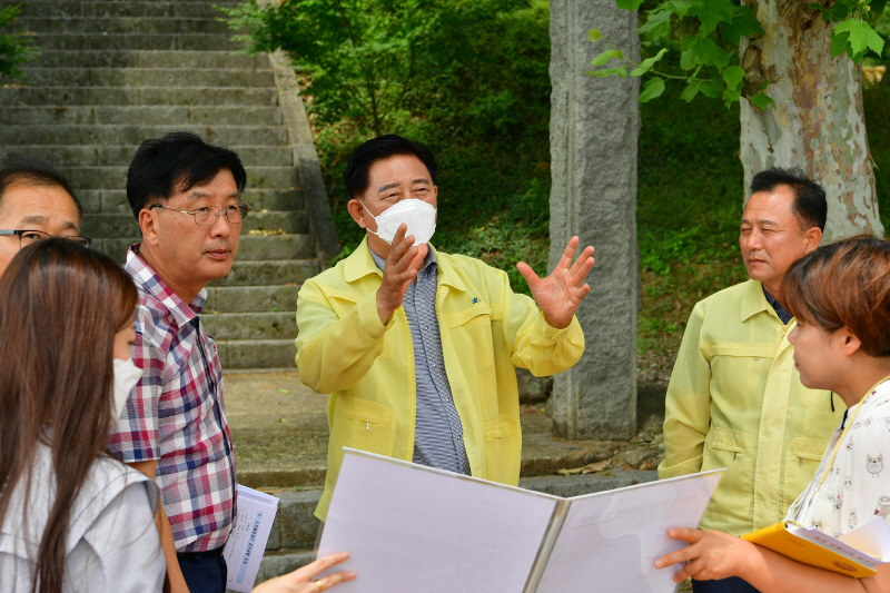 김한종 장성군수가 불태산 역사문화테마길 조성사업 현장을 방문해 추진상황을 점검하고 있다.