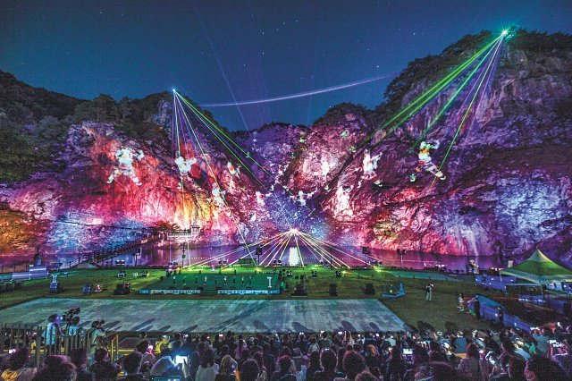 저녁에는 조명으로 몽환적 분위기… 자연 암벽과 빔프로젝터 활용해