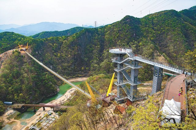 올해 준공을 목표로 케이블카와 산악에스컬레이터 공사도 한창이다. 케이블카는 하부 탑승장에서 출렁다리까지 972m 구간에 설치된다. 10인승 캐빈 22대가 초속 5m의 속도로 5분 만에 이동한다. 장애인과 노인, 어린이도 출렁다리까지 올라 즐거움을 맛볼 수 있다.