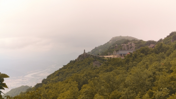 멀리서 본 대구 비슬산의 대견사 전경. 산아래 왼쪽에 대구 달성군이 손에 잡힐 듯 보인다.