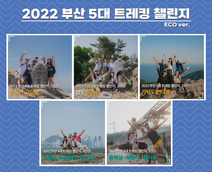 트레킹 코스는 ▲금정산 ▲봉래산 ▲가덕도 연대봉 등 마운틴코스 3곳과 오션코스(2곳) ▲오륙도~이기대 ▲동백섬~청사포 등 오션코스 2곳으로 마련됐다.