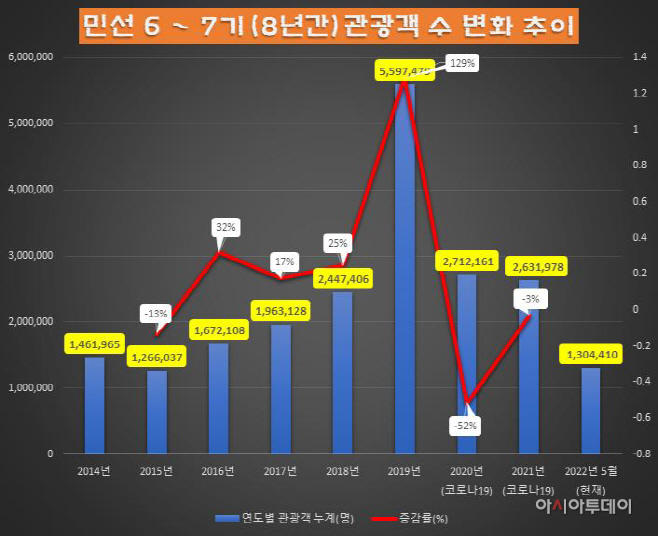 예산군 민선6·7기 관광객 수 변화 추이./제공=예산군