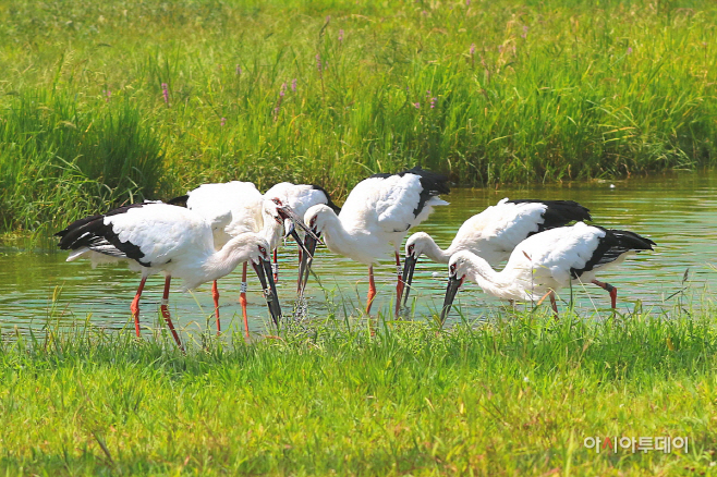 예산군 광시면에 위치한 황새공원에서 황새들이 먹이를 먹고 있다./제공=예산군