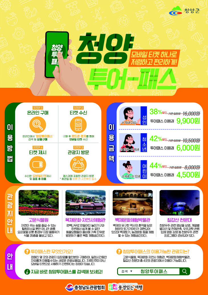 관광투어패스는 지역 관광지의 입장료를 할인 판매하는 통합할인 상품권이다. 공주시와 부여군이 연계한 백제투어패스가 있지만, 단일 시·군으로는 청양이 유일하게 개발과 판매를 한다.