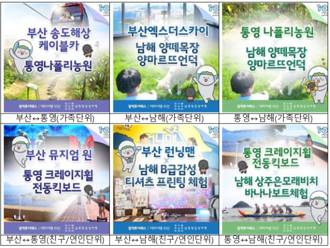 투어코스패스권을 구매하고자 하는 가족 단위 관광객이라면 ▲부산 송도해상케이블카-통영 나폴리공원 ▲부산 엑스더스카이-남해 양떼목장 양마르뜨 언덕 ▲통영 나폴리공원-남해 양떼목장 양마르뜨 언덕 패스권을 추천하며, 친구 또는 연인과 함께라면 ▲부산 뮤지엄원-통영 크레이지 휠 전동킥보드 ▲부산 런닝맨-남해 B급감성 티셔츠프린팅체험 ▲통영 크레이지 휠 전동킥보드-남해 상주은모래비치 바나나보트체험 패스권을 추천한다고 시 관계자는 밝혔다.