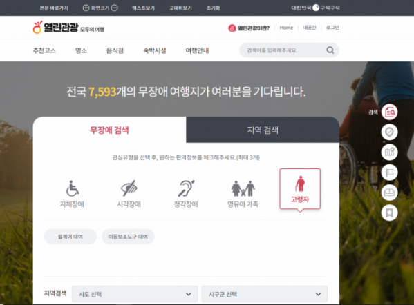 이외에도 ‘열린관광 모두의 여행’ 홈페이지를 이용하면 무장애 관광정보를 얻을 수 있다. ‘열린관광 모두의 여행’은 문화체육관광부와 한국관광공사가 지난 2월 개설했다. 텍스트 크기 조정과 음성 지원, 시각적 편의를 높인 고대비 보기 등의 기능을 추가해 실질적 수요자인 고령자, 장애인 등의 정보 접근성을 개선한 점이 특징이다.