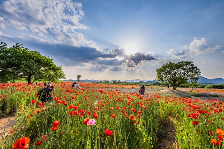 6일 함안군농업기술센터에 따르면 법수면 악양둑방길 6.5km와 둔치 12만8925㎡에 꽃양귀비와 수레국화, 금영화 등으로 꽃단지를 조성·운영한 결과 지난달 1일부터 한 달 동안 약 20만 명이 다녀간 것으로 추정하고 있다.