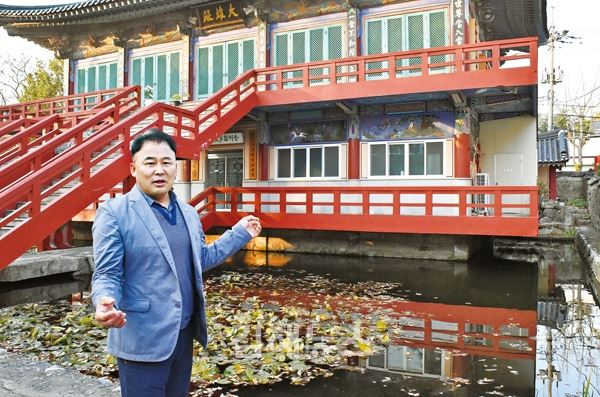 ▲ 김창수 의원이 김해 동상전통시장 내에 위치한 연화사를 방문해 지역의 문화역사를 활용해야 한다고 강조하고 있다. 조나리 기자