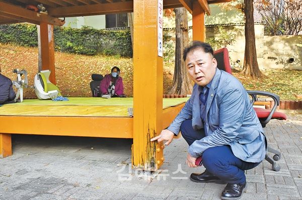 가장 먼저는 노인들이 앉아있던 정자였다. 나무로 만든 정자의 밑동 부분이 삭아 있었다. 김 의원은 "공원의 정자는 주민들이 정말 많이 이용하는 곳이다. 이렇게 어르신들이 앉아있는 데다 정자 위에 나뭇가지 무게까지 더해지는데 나무가 삭아서 위험한 상황"이라고 설명했다.