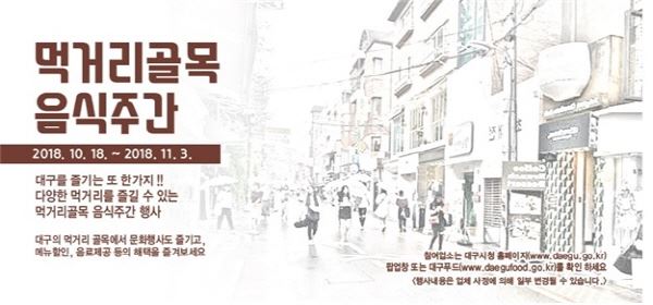 (대구=국제뉴스) 백운용 기자 = 대구시(시장 권영진)는 10. 18일부터 11. 3일까지 '가을 먹거리골목 음식주간' 행사를 개최하여, 다양한 할인과 문화공연 등으로 시민들에게 즐길거리 제공과 침체된 외식업소 활성화를 도모한다.