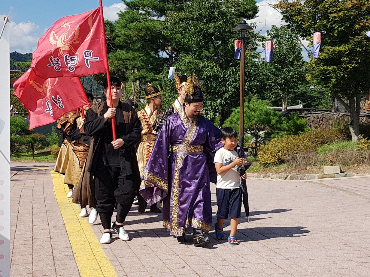 웅진백제 역사 재현 관광 프로그램에 시민들이 참여하여 공연하는 사진. / 공주시