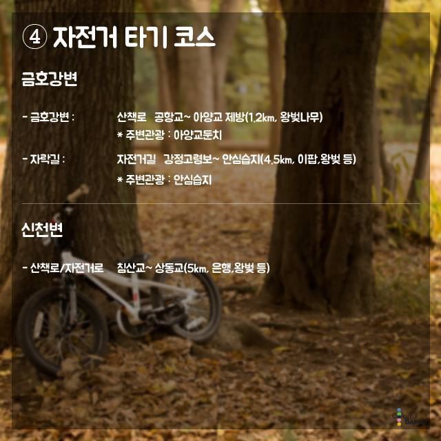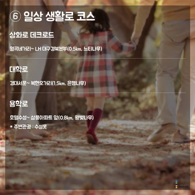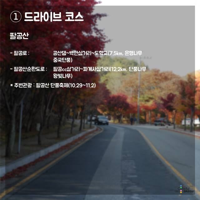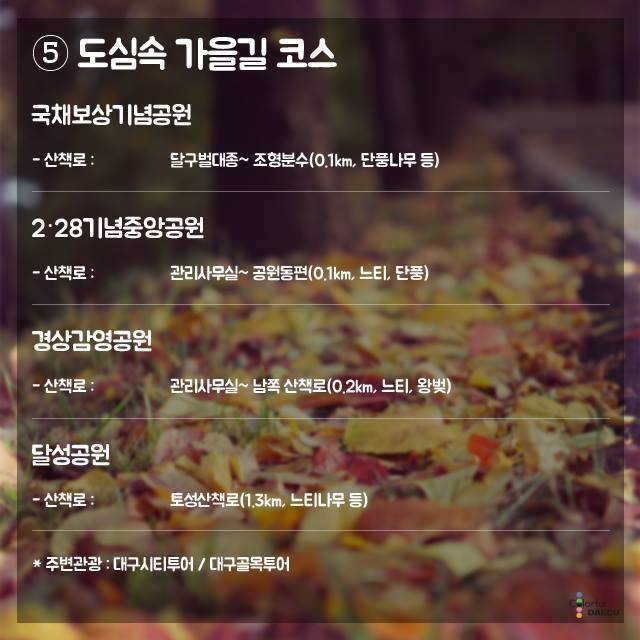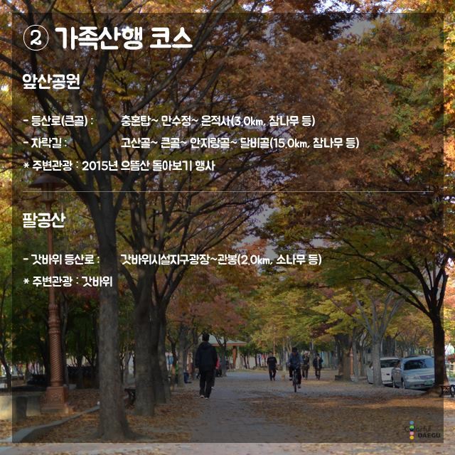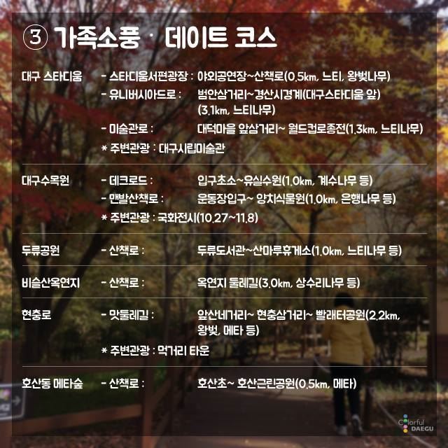 도심에서 쉽게 찾을 수 있는‘추억의 가을길 운영자 0 426 2015.10.22 15:42 대구광역시에서 선정한 도심에서 쉽게 찾을수 있는 "추억의 가을길" 입니다.코스별로 잘 구분되어 있으니 참고하셔서 연인과 함께 걸어보시면 좋은 추억이 될 것 같습니다.출처- 대구광역시 페이스북