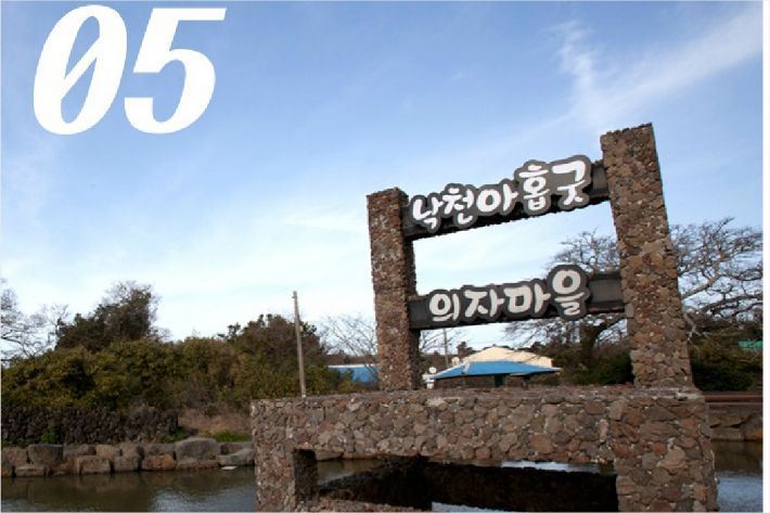 제주말 ‘굿’은 연못처럼 물이 고인 곳이란 뜻. 마을 초입에서 큰 연못을 볼 수 있다. 천 개의 의자로 조성한 ‘낙천의자공원’을 만나면 생각이 달라진다. 다양한 의자 조형물은 주변 자연과 조화를 이루어 각각의 의자마다 한 폭의 그림을 그려내고, 의자마다 새겨진 이름의 작명 센스에 웃음꽃이 저절로 피어난다.